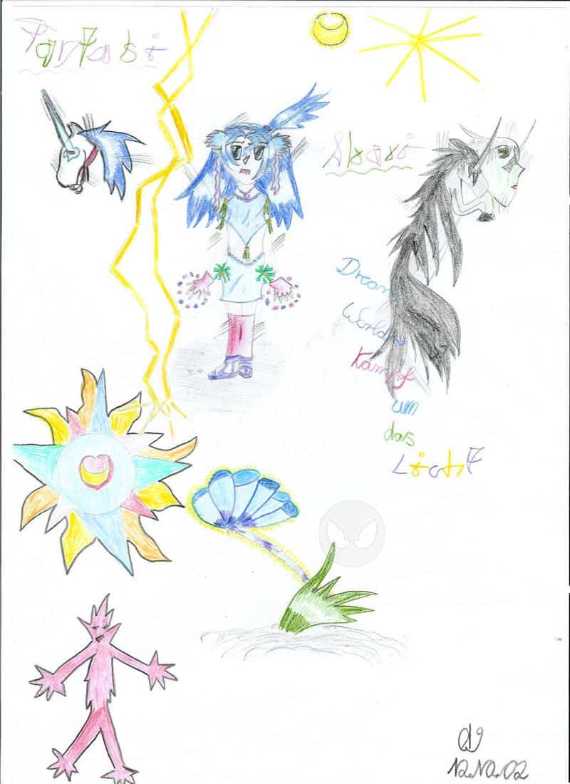 Also das Mädchen ist Akari das Einhorn links ist sie wenn sie sich in ein Einhorn verwandelt sie zaubert gerade und deswegen diese Blitze für des Bild hab ich mir sehr viel mühe gegeben aber als ich das ´schwaze Einhorn und das Gesicht daneben und das Monster unten gezeichnet habe war ich sehr Müde und das Gesicht sollte nicht Grün sein hehe ich war so müde das ich als versheen die Falche Farbe genommen habe und es soll oben links Fantasy oben rechts Akari und dann beim schwarzen ein Horn heißen: Dream World-Kampf um das Licht man ich schreib schon wieder so viel aber das ist des letzte bld für heute Eure Akari