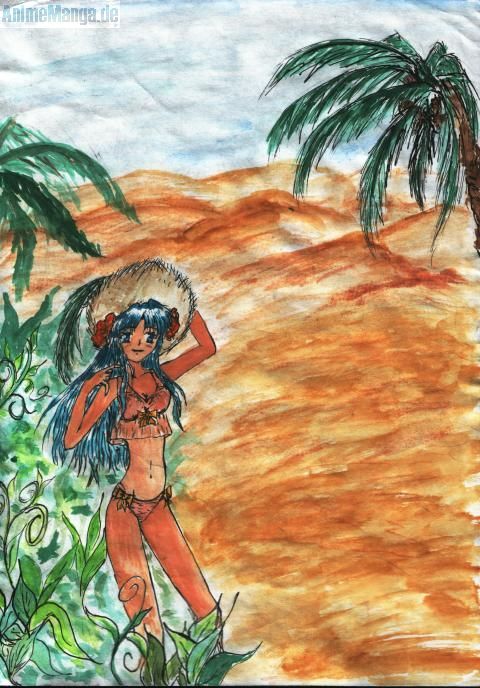 dieses bild sollte ich für den schulabschluß zeichnen ( der tittel lautete : entlich die oase erreicht) was ich gemein fand war, ich zeichne dieses bild und geb es ab, kurtze zeit später bekomme ich es wieder und sie haben ein blödes strichmänneken in ner hängematte genommen!!!! verstehe einer die lehre!!! ;( naja war aber trotzdem eine coole entlassfeier :)