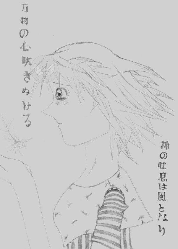 Ich weiß, das Bild ist nicht so gut geworden... ich habe es eigentlich auch nur wegen der japanischen Schrift reingestellt, für die ich mindestens doppelt soviel Zeit als für das Bild gebraucht habe. Ich habe sie aus dem Artbook von Jeanne abgezeichnet und das war gar nicht so einfach... tatsache ist, das es übersetzt: Gottes Atem wird zum Winde und durchdringt die Herzen" heißt.