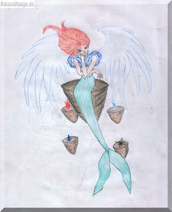 Ebenfalls zur gleichen zeit wie Water und wood entstanden. Ichhabe eine Vorliebe für Engel. und in diesem Bild vereine ich alle 4 Elemente. Die Flügel stehen für die Luft, die meerjungfrauenflosse für das Wasser, die Haare für das Feuer und der Stein auf dem sie sitzt für Erde.