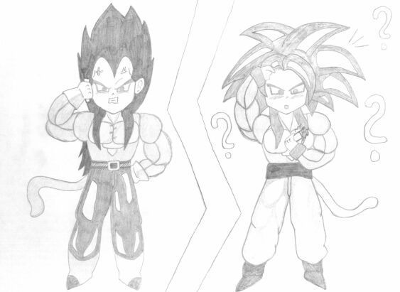 Angriff der chibi ssj4Trunks der Daywalker die 2.teTrunks der Daywalkergoku und vegeta als ssj4Goku und Vegeta mal in FarbeGoku salutiert