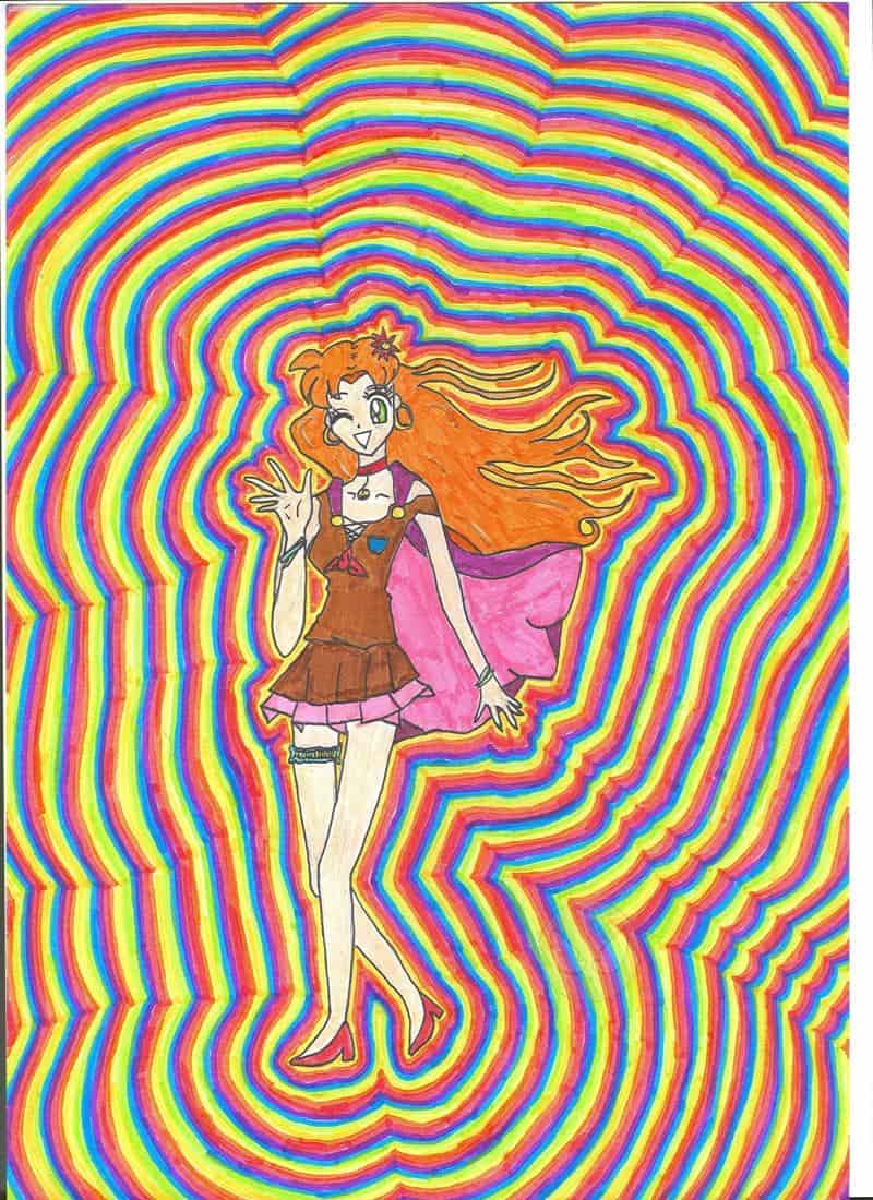 So schauen Leute die sich grade Haschisch reingezogen haben. Sie sehen alles viel intensiver und hässliche Frauen werden zu Schönheiten. Wenn man genau hinguckt, sieht man, dass ich die Beine völlig falsch gemalt habe. An den bunten Strichen hab ich lange gebraucht, hat aber Spass gemacht. Welches Bild ist das eigentlich? Nummer 7? Oder 6? Ach keine Ahnung.