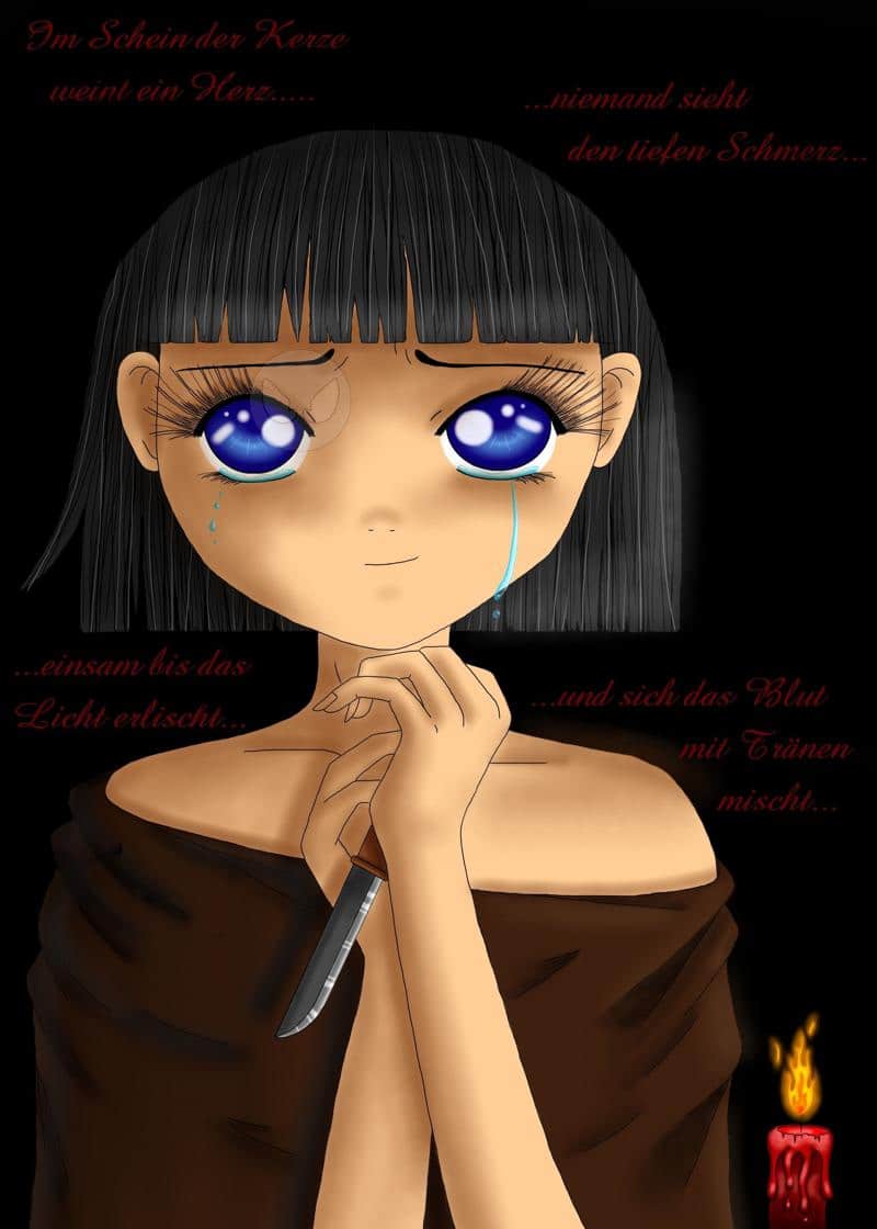 Naja, ich denke mal der Text und das Bild sagen alles....Sie weint und hat ein Messer in der Hand....sie wird sich die Arme ausschneiden sobald die Kerze erlöschen ist....