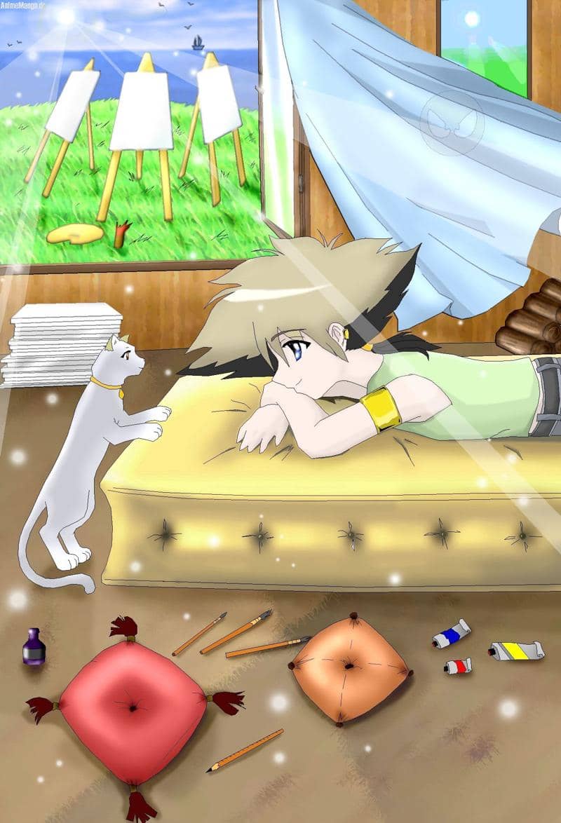 If you have forgotten then Yasuo is the boy and the cat is caled Sumi (well this name gave her Yasuo) and she is a girl from anciant Egipt ^__^ look in previous pics to find her =)
