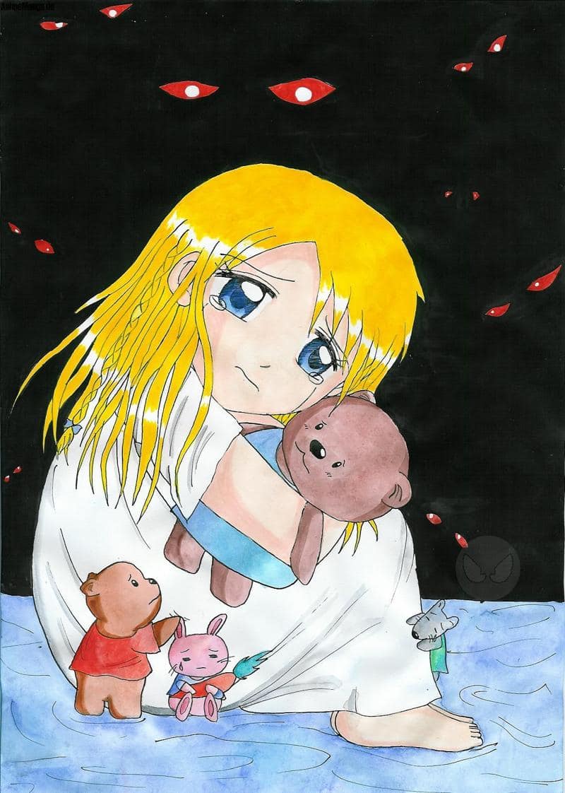 Als ich einen Wettberwerb entdeckt habe, bei dem man Mädchen mit Bären zeichnen sollte, wollte ich das auch unbedingt malen. Deshalb ist dieses Bild entstanden. Na ja, das Mädchen soll halt Angst haben, Angst vor dem, was im Dunkeln lebt. Später ist mir aufgefallen, dass ich schon mal ein Bild mit der Selben Idee gezeichnet hatte, aber dieses hier find ich süßer. Ich mag vor allem die kleinen Kuscheltiere, die sie versuchen zu trösten, sowelche hätt ich auch gern.