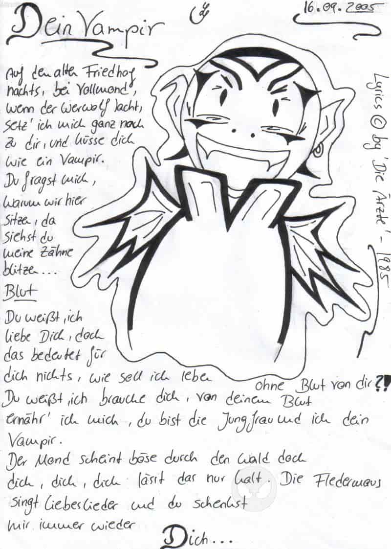 Das, was ich in den HG gekritzelt hab, ist ein Ausschnitt aus dem Lied ,Dein Vampir´ aus dem Album: Im Schatten der Ärzte ...