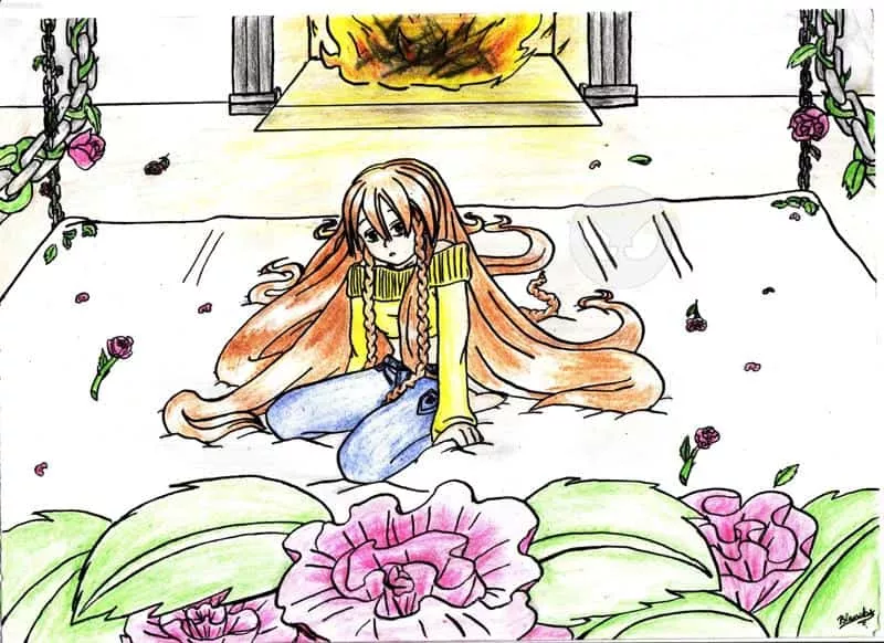 Hi ihr!^^ Dat Bild hab ich ursprünglich für einen Wettbewerb gemalt, aber so wie ich halt bin^^°°°°, hab ich den Abgabetermin verpasst....TT Aber egal, ich wollts euch trotzdem nich vorenthalten. Der Titel bezieht sich auf das Feuer im Hintergrund. Es brennt dahinten nämlich nich normales Holz sondern Rosenholz! *smile* Leider is das Feuer nich so toll geworden, wie ichs mir vorgestellt habe!^^