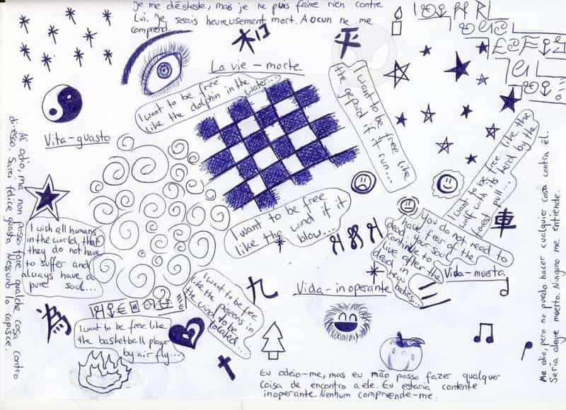 Ich hab nua so rumgekritzelt... da stehen Sätze in verschiedenen Sprachen .. Italienisch, Spanisch, Englisch, Französisch... Hoffe es wird überhaup hochgeladen...