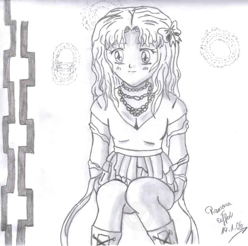 Hi, ich bins nochmal.Diese Fanart habe ich auch so vor vier tagen gezeichnet.Mir besonders gefallen ja die Haare und diese süße Schleife so gut ^^